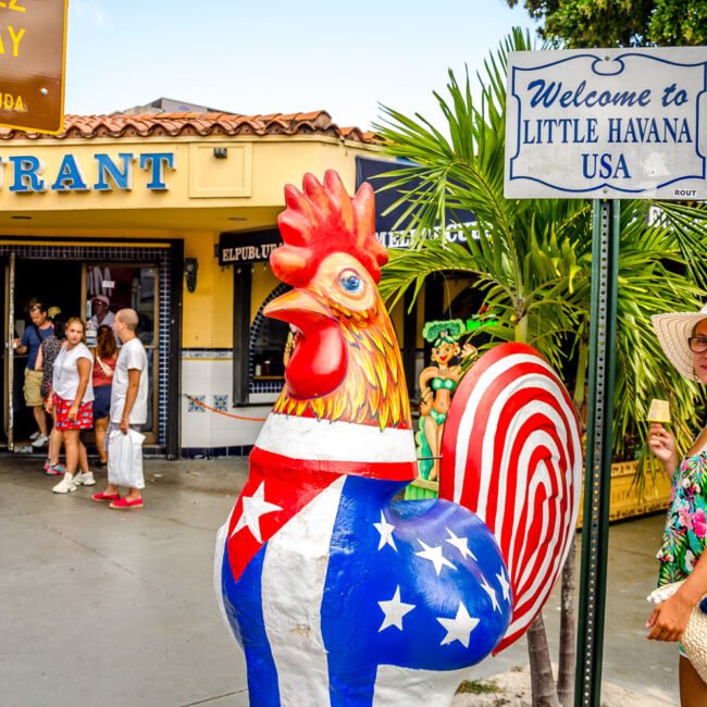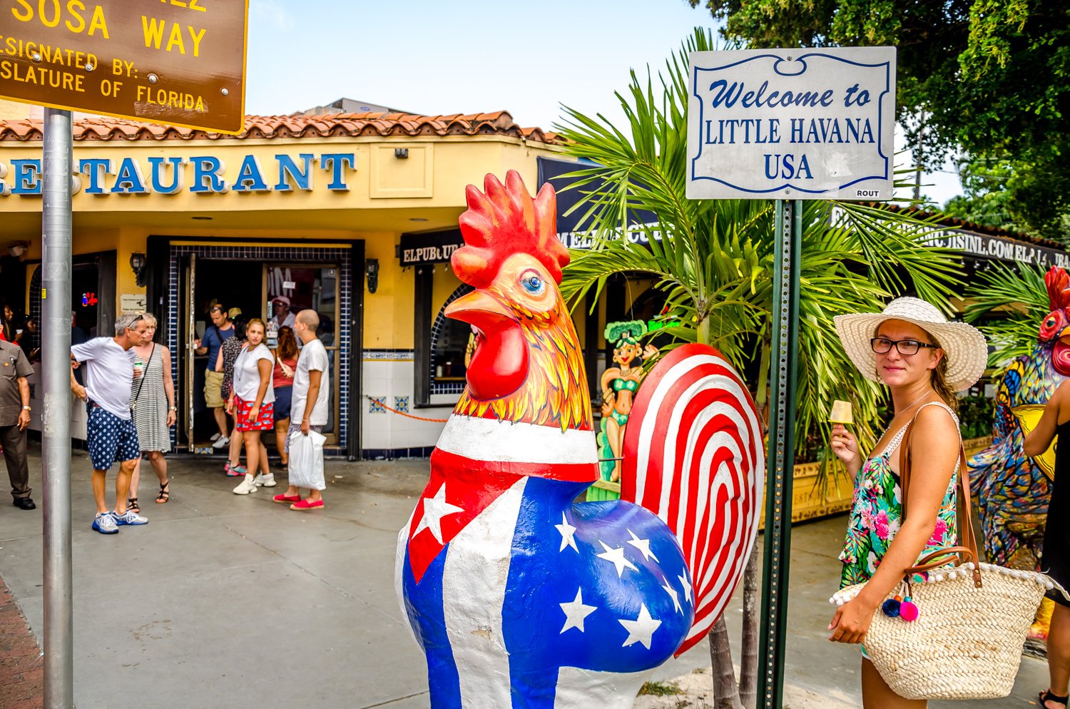 There was still plenty of time, so we decided to see another famous part of Miami, namely Little Havana. I wasn’t prepared for it, but I thought it wouldn’t be a problem to find the interesting things. However, as I circled the streets around the inscription Little Havana, according to Google Maps, I found absolutely nothing that resembled a touristy busy street. We saw mostly empty and dirty streets, where nothing was interesting. We had to stop somewhere at McDonald’s and look on the internet where we were actually supposed to go. Only then did I start to notice and realise how big and fairly poor the Little Havana district is. We found out that we were looking for Calle Ocho Walk of Fame, which is the eighth south-west street and thus still a bit south of the places where we were wandering around. This street finally fulfilled our expectations and we found ourselves in a busy place full of music, colours, cigars and of course, roosters. There is something to look at, and thanks to the specific atmosphere, this place left a very good impression on us and the desire to go and see what it looks like in that real Havana, in Cuba.