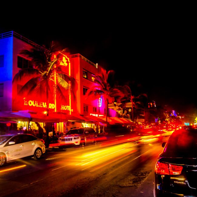 Edit TemplateWe returned to the car after dark, and since I had already sobered up a bit, we were ready to continue our journey. Lenka reproached me a bit and still reproaches me that she was most looking forward to Miami Beach and enjoyed it the least. I don’t see it that tragically, and I say that it was just right. We saw what you needed to see there, and we were actually lucky that we got to the beach at all, because it wasn’t raining at the time. If we had planned several days there, it would be a waste of time and money. Such tourist places full of consumption are money vacuums, in my opinion, for little music. After all, we paid $45 for just that one, approximately one-hour sitting on the terrace in the aforementioned establishment. I even wanted to be an obedient tourist and left a tip. Only after a few days did I find out that that establishment had withdrawn two sums from my card, one including the tip and the other without. I had to deal with the given establishment and my bank for several months before one payment was returned to me. Even though I was asking for the smaller one, the larger one came back, but that’s one thing. I don’t like the frequent way of paying by card in America at all. The waiter took my card with him and came back with a receipt, on which I was supposed to write the amount of the tip with my signature, and only after that was the given amount supposed to be withdrawn from the card. The fact that I was charged incorrectly only happened once, and it turned out well in the end, but every time I paid in this style with a signature and without a PIN code, it evoked a feeling of mistrust in me. Anyway, spending half of the daily budget in an hour can happen from time to time during such travelling, but definitely not every day. I comforted Lenka that we have to come to Miami Beach in winter, when there is a season, the weather will be better, and we will be able to enjoy it a little more. Cheap flights and accommodation can be obtained, and overall, a reasonable holiday can be made from it. This time, however, it was about something else… After getting into the car, we did not miss the opportunity to drive around the streets of Miami Beach again and again, this time in the dark and enjoy this place also in the light of the neons.