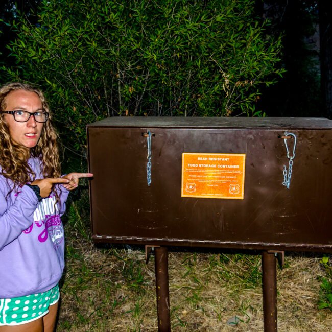 There is only one main road leading through Sequoia National Park, which is not very long, but due to constant turns, driving through it takes quite a while. When exiting the park, there were still many turns, but they were no longer as sharp as before, and when there wasn’t much traffic, I enjoyed the ride quite a bit. Lenka complained again that she would get sick. In the end, I was also glad that we were finally on the plain and finally getting closer to our destination faster. We wanted to get as close as possible to Yosemite National Park. We managed to do it, and in the end, even though with a bit of trouble and in the dark, we managed to find a place to spend the night in a tent. There were a few sites next to the river, where again we were supposed to pay, this time even $26 for the night, but we didn’t pay anything and hoped that no one would come to ask us for the fee. We unfolded at the last available spot, and even though we had quite far to the car, we made quite a nice evening by the fire with wine and baked sausages. The presence of a metal box for food made us realise that we were again in a location with bears.