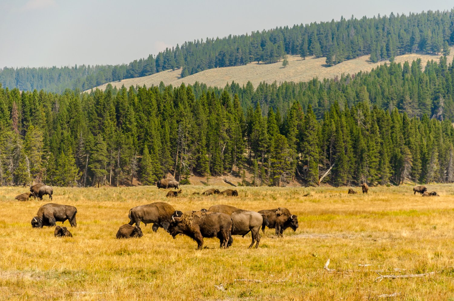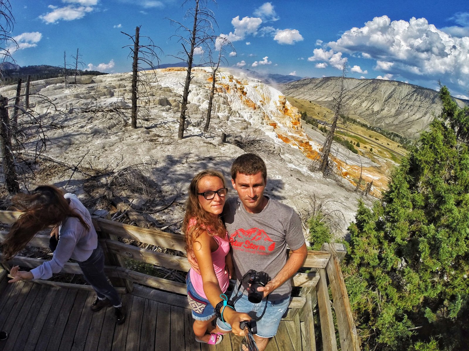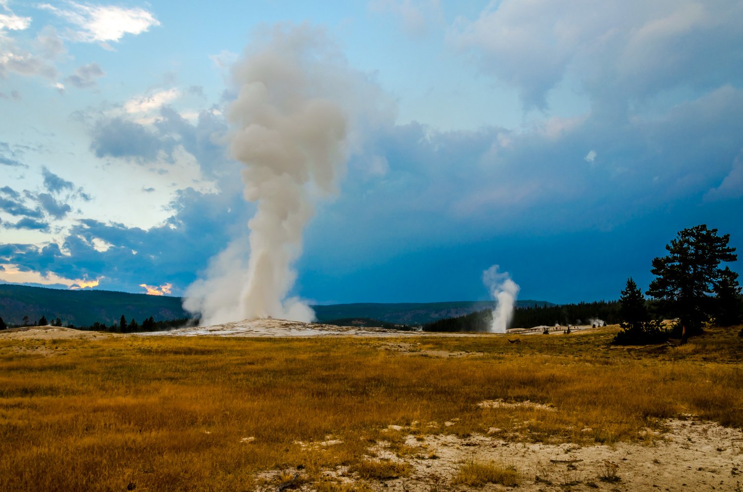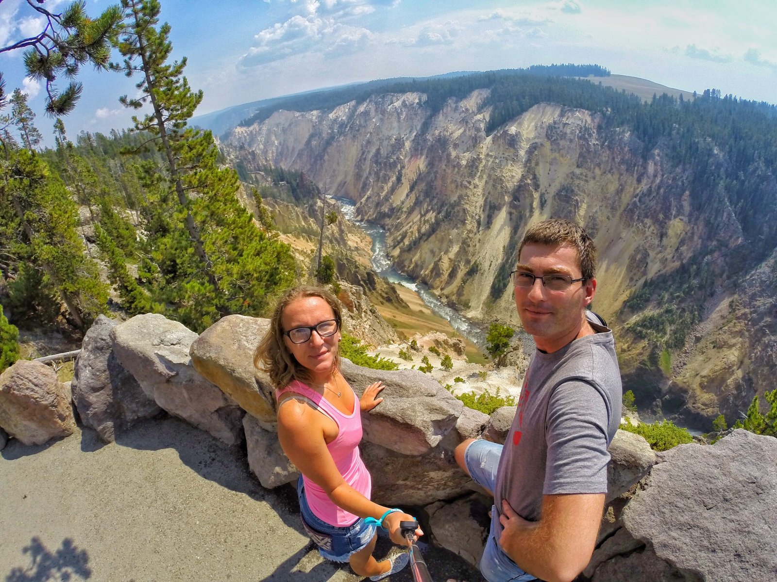 We didn’t have far to the gates of Yellowstone National Park anymore. Upon entering, we received maps with descriptions of famous places and the biggest attractions. According to the map, it was clear that you can go on two circuits around Yellowstone – one smaller and the other larger. We chose the larger one, of course, since we were also attracted by the more remote places. The very first attraction and surprise for us was a bison, to which we first got very close. Then, for a long time, we met herds of bison on the prairies, which we passed around. Famous places followed, such as the Grand Canyon of the Yellowstone and Tower Falls, at which we stopped for a while and took a short walk. However, other natural beauties such as Mammoth Hot Springs, Norris Geyser Basin and especially Grand Prismatic Spring, which was probably the top of the entire Yellowstone, were like something from another planet. Springs of incredible colours from deep blue to orange were complemented by strange scents and billowing steam. It was already a little drizzling and cooling at this place, but the heat radiating from the springs was quite enough to warm up sufficiently. Our last stop was the geyser Old Faithful, where we waited for the regularly recurring eruption at sunset.