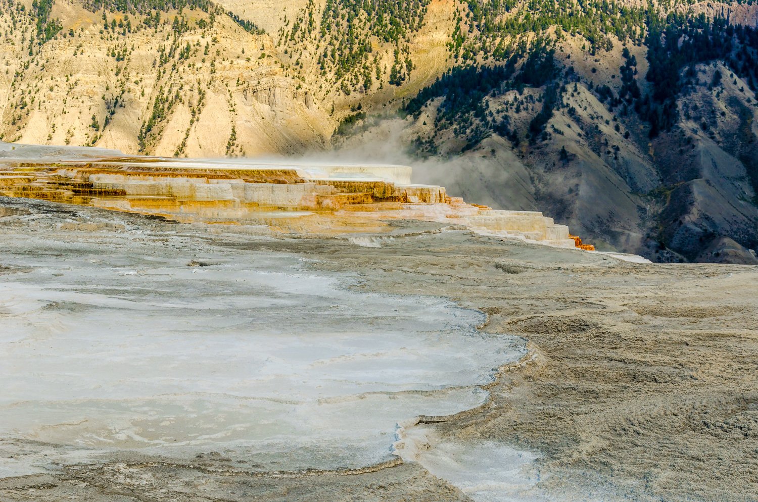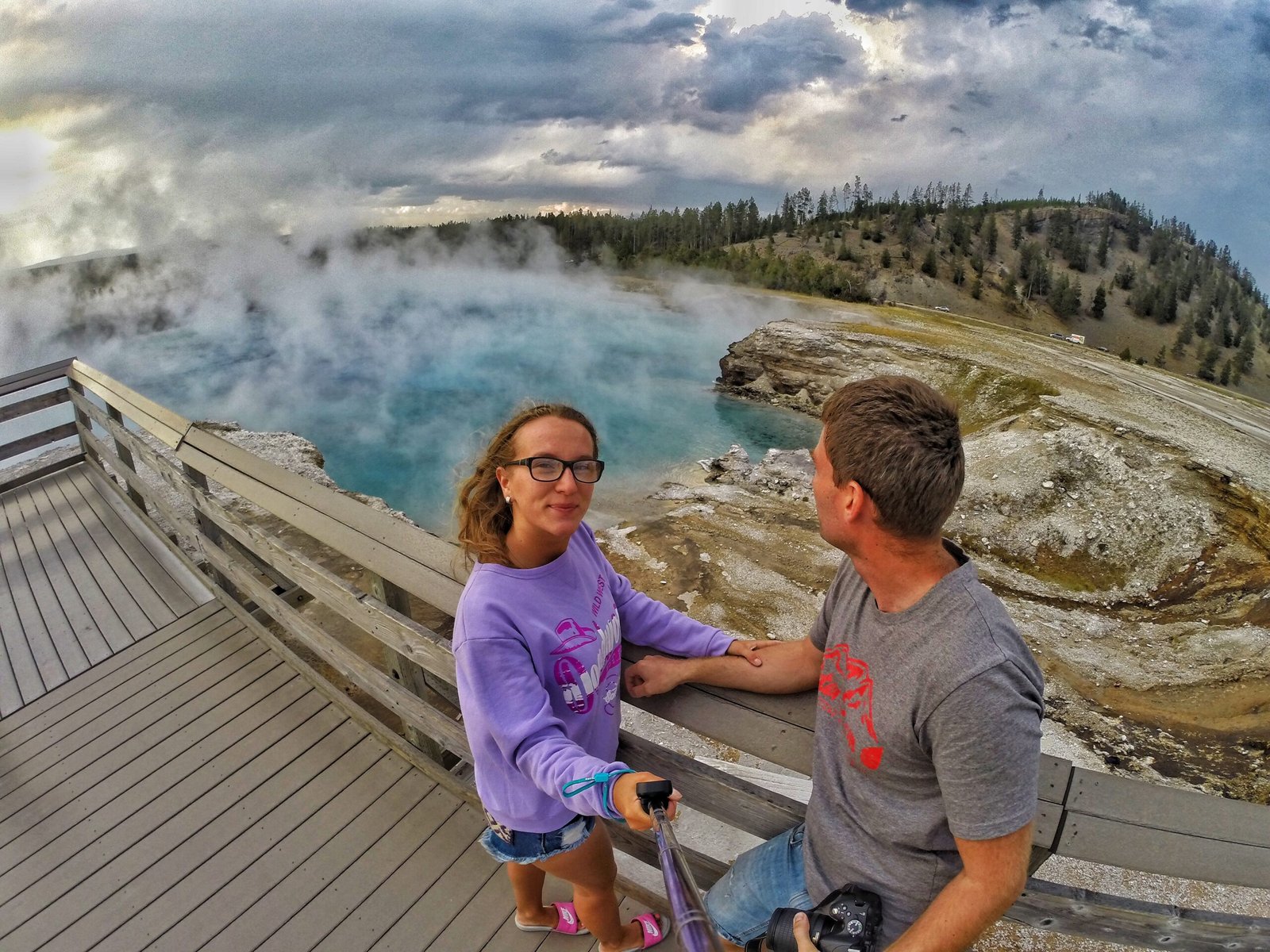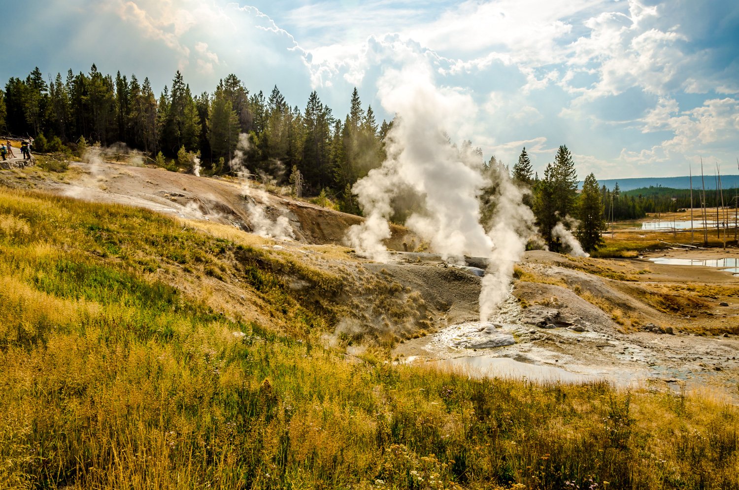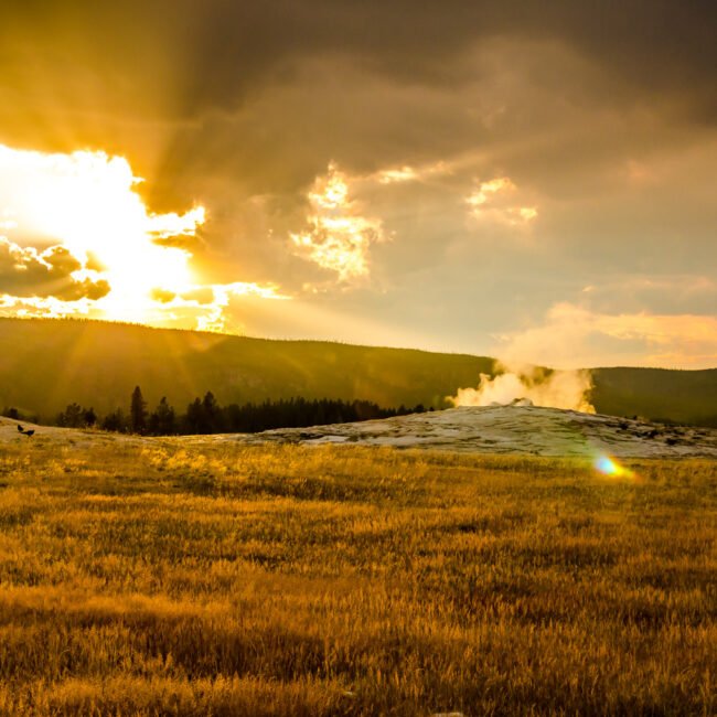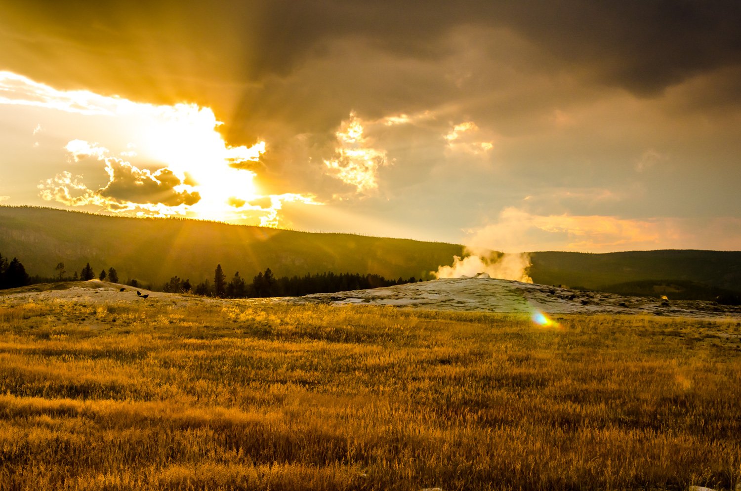 We didn’t have far to the gates of Yellowstone National Park anymore. Upon entering, we received maps with descriptions of famous places and the biggest attractions. According to the map, it was clear that you can go on two circuits around Yellowstone – one smaller and the other larger. We chose the larger one, of course, since we were also attracted by the more remote places. The very first attraction and surprise for us was a bison, to which we first got very close. Then, for a long time, we met herds of bison on the prairies, which we passed around. Famous places followed, such as the Grand Canyon of the Yellowstone and Tower Falls, at which we stopped for a while and took a short walk. However, other natural beauties such as Mammoth Hot Springs, Norris Geyser Basin and especially Grand Prismatic Spring, which was probably the top of the entire Yellowstone, were like something from another planet. Springs of incredible colours from deep blue to orange were complemented by strange scents and billowing steam. It was already a little drizzling and cooling at this place, but the heat radiating from the springs was quite enough to warm up sufficiently. Our last stop was the geyser Old Faithful, where we waited for the regularly recurring eruption at sunset.