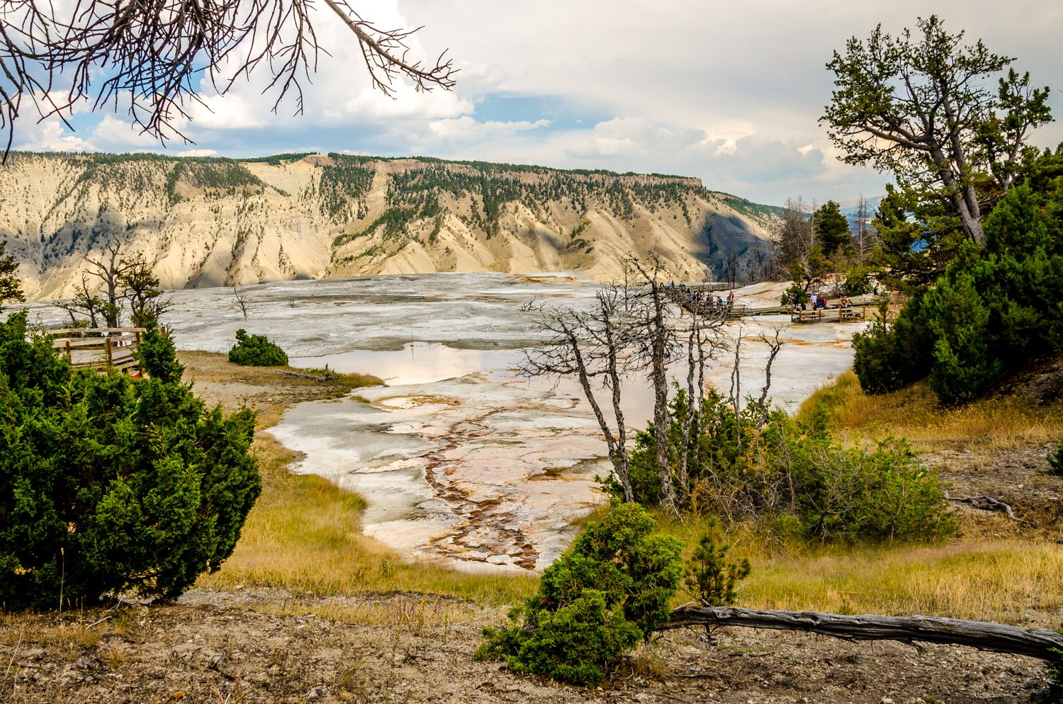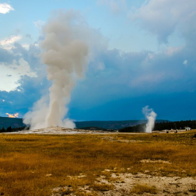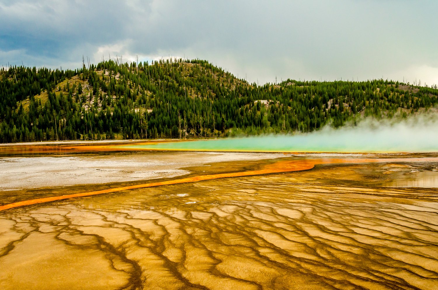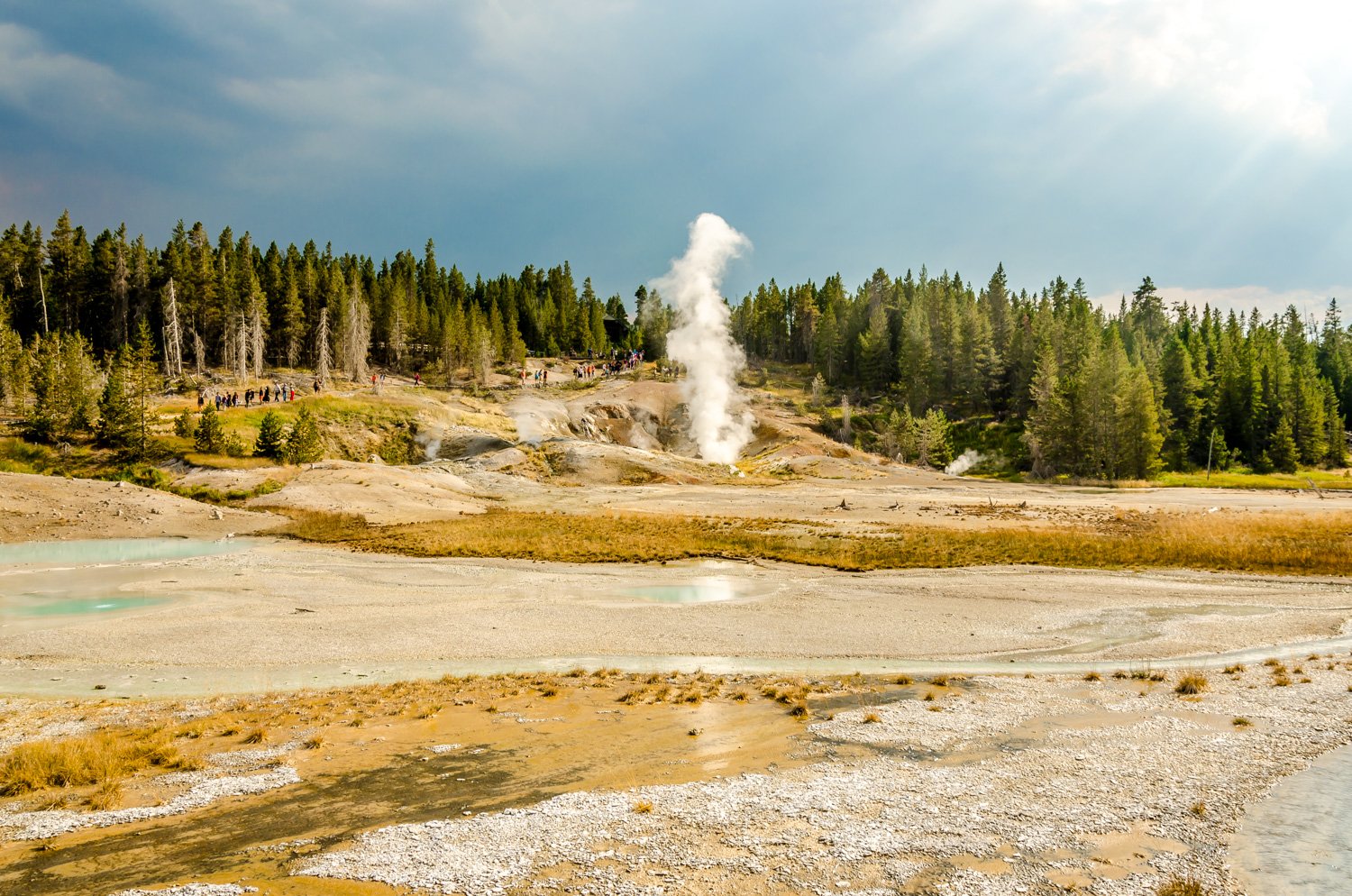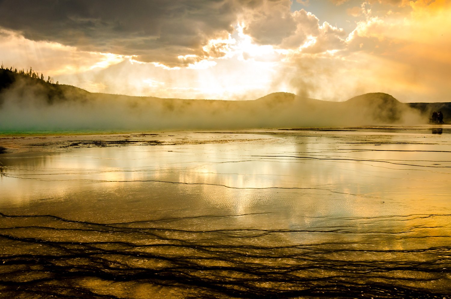 We didn’t have far to the gates of Yellowstone National Park anymore. Upon entering, we received maps with descriptions of famous places and the biggest attractions. According to the map, it was clear that you can go on two circuits around Yellowstone – one smaller and the other larger. We chose the larger one, of course, since we were also attracted by the more remote places. The very first attraction and surprise for us was a bison, to which we first got very close. Then, for a long time, we met herds of bison on the prairies, which we passed around. Famous places followed, such as the Grand Canyon of the Yellowstone and Tower Falls, at which we stopped for a while and took a short walk. However, other natural beauties such as Mammoth Hot Springs, Norris Geyser Basin and especially Grand Prismatic Spring, which was probably the top of the entire Yellowstone, were like something from another planet. Springs of incredible colours from deep blue to orange were complemented by strange scents and billowing steam. It was already a little drizzling and cooling at this place, but the heat radiating from the springs was quite enough to warm up sufficiently. Our last stop was the geyser Old Faithful, where we waited for the regularly recurring eruption at sunset.