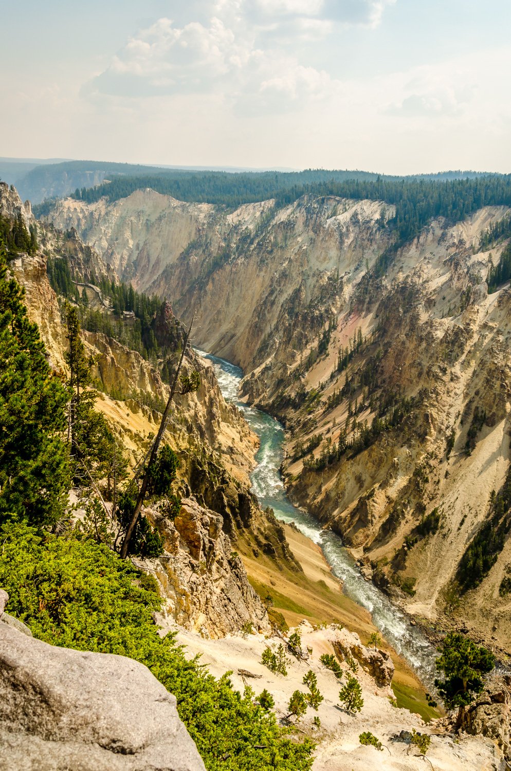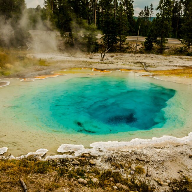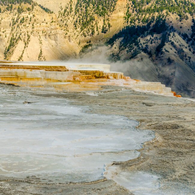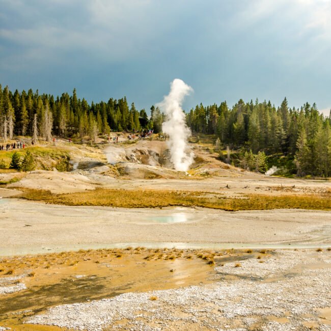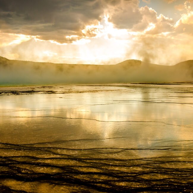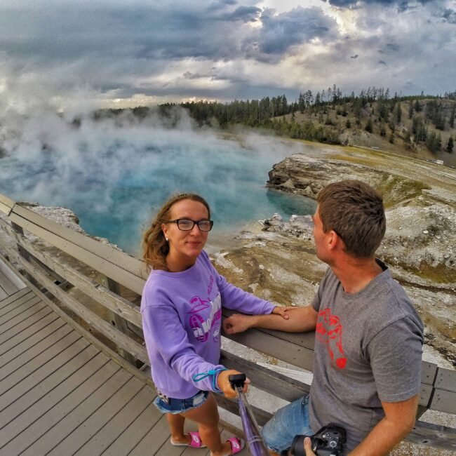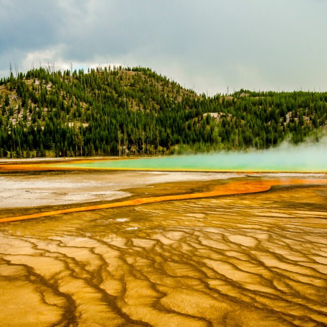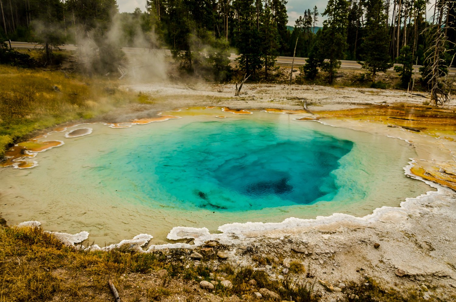 We didn’t have far to the gates of Yellowstone National Park anymore. Upon entering, we received maps with descriptions of famous places and the biggest attractions. According to the map, it was clear that you can go on two circuits around Yellowstone – one smaller and the other larger. We chose the larger one, of course, since we were also attracted by the more remote places. The very first attraction and surprise for us was a bison, to which we first got very close. Then, for a long time, we met herds of bison on the prairies, which we passed around. Famous places followed, such as the Grand Canyon of the Yellowstone and Tower Falls, at which we stopped for a while and took a short walk. However, other natural beauties such as Mammoth Hot Springs, Norris Geyser Basin and especially Grand Prismatic Spring, which was probably the top of the entire Yellowstone, were like something from another planet. Springs of incredible colours from deep blue to orange were complemented by strange scents and billowing steam. It was already a little drizzling and cooling at this place, but the heat radiating from the springs was quite enough to warm up sufficiently. Our last stop was the geyser Old Faithful, where we waited for the regularly recurring eruption at sunset.
