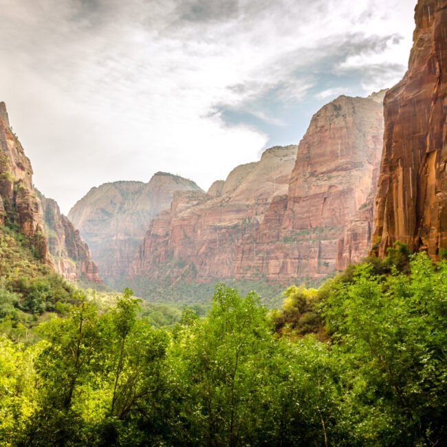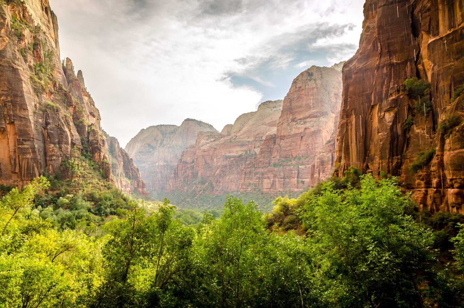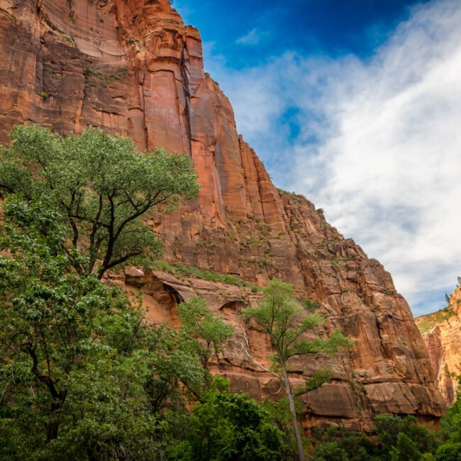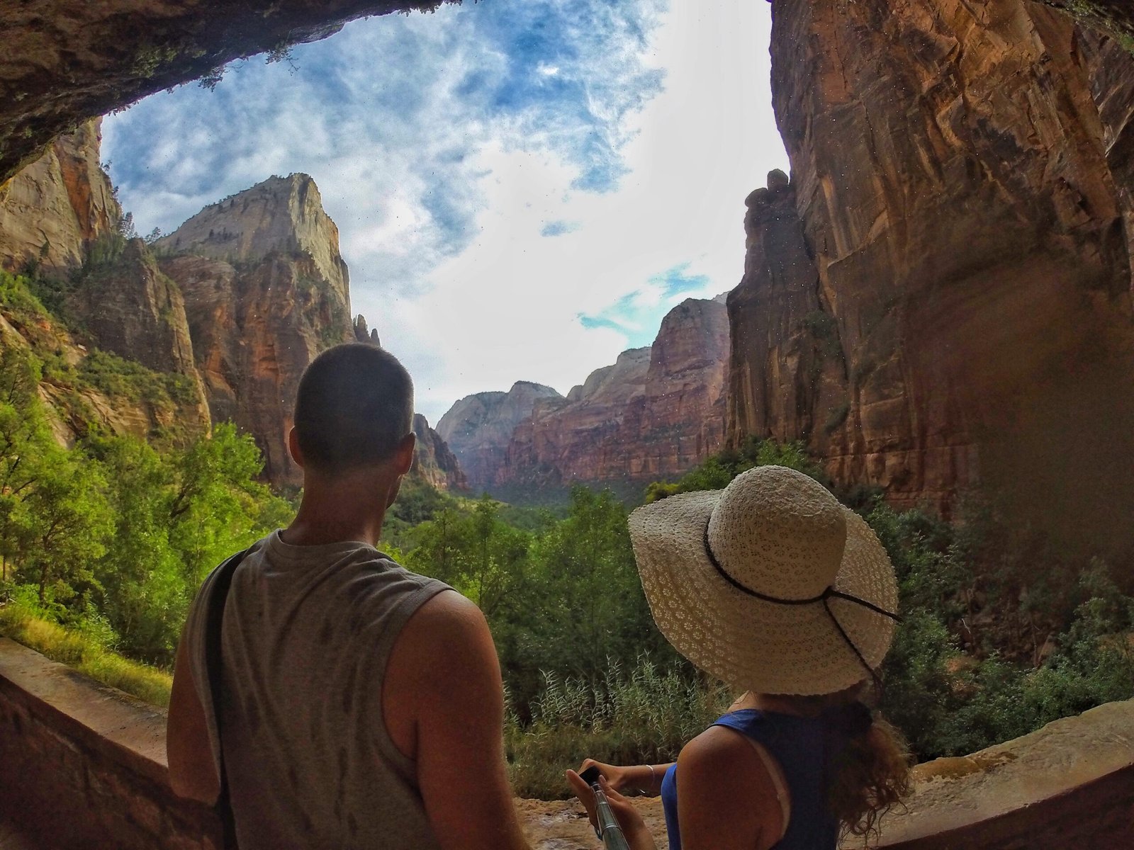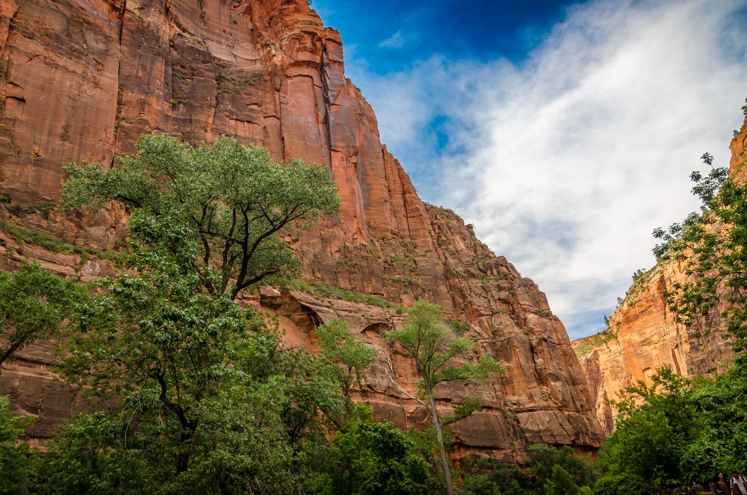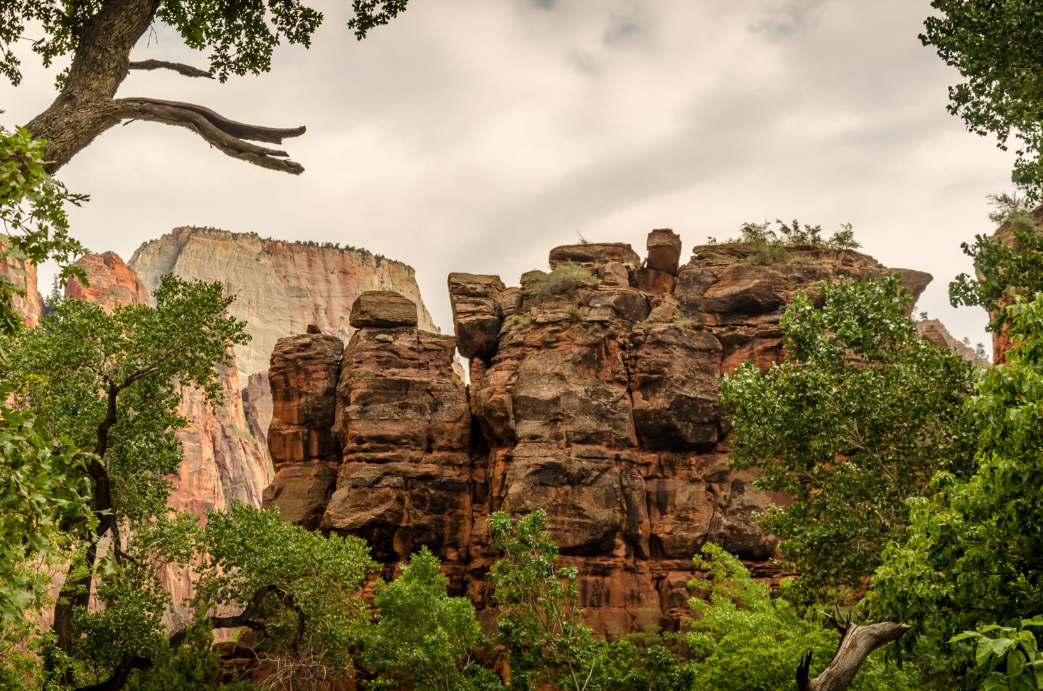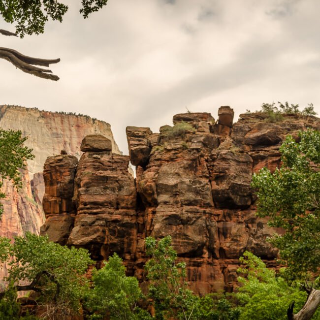 After studying the map of the shuttle service and based on pre-stored places as well, we decided to ride to the last stop, where supposed to find more interesting stuff, and then on the way back, we would get off at places that we liked, or for which we simply had time left. Already, the ride in the minibus train was interesting, and there was something to look at. Really beautiful red rocks stretched up along the road. After getting off at the last, ninth stop, we also understood here that Zion should be enjoyed best with longer hikes. As usual, we didn’t have time for that. So we at least had a closer look at various rock formations, some of them even had a name. After moving back to the seventh stop, we did a shorter walk anyway. Fortunately, the Americans have always designed it so that even really lazy people can see the best, or so that it is not difficult even for families with children. And so in less than half an hour, we were in one of the most beautiful places in Zion, where we got to the edge of one of the rocks with a beautiful view and falling water over our heads.