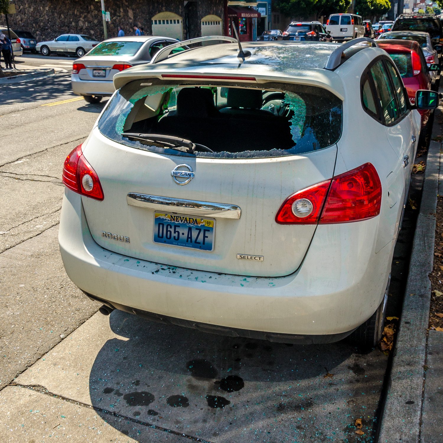 Edit TemplatePier 39 is very nice, huge, and full of colours, scents, music, and people. The sun finally peeked out, so we enjoyed the views of Alcatraz, the Golden Gate Bridge from a different angle and various other attractions. Certainly one of the biggest was the seals, which had floating pontoons on the water here, where they were just basking or showing off in front of people. In the two hours that we spent here, we also visited a few shops and ate something. Our next goal was to walk a bit on the crooked streets for which San Francisco is known, we wanted to see and hopefully also drive the most famous and winding of these crooked streets, Lombard Street, and park somewhere again where you could ride the trams typical for SF. All these plans completely fell apart after returning to the car. The first thing we noticed was a small piece of paper behind the windscreen wiper, and it immediately occurred to me that we had received a parking ticket. When I held the paper in my hand and read that we were supposed to contact the nearest police station, it only strengthened my belief that it was really a parking ticket. Only when I looked through the car and saw the broken glass on the door to the trunk, I completely froze, then I started shaking and announced to Lenka that we had been robbed. She didn’t even have time to properly ask what I was talking about, and we were already standing in front of a broken, half-empty trunk. An incredible stream of thoughts started swirling in my head, Lenka burst into tears in a moment, and while I started to comfort her, I managed to check whether we had at least the backpack with the most valuable things, passports, tablet, photos and the like, which I always carried with me, but this time I left it under the rear seat. Fortunately, the backpack was untouched, and in the car we saw that we also had our largest suitcase left, which the thief probably couldn’t carry anymore, didn’t manage to lift or simply didn’t fit through the rear, not very large, window. Since I had absolutely no overview of how we had packed our things, that was Lenka’s job; through tears, I forced her to answer questions about what we even had in that huge suitcase. The first questions concerned souvenirs, gifts, magnets and things that we had acquired during almost two months on the road and had a great mental value for us. Fortunately, I got a positive answer to almost all the questions that I had. Lenka very reasonably packed into this large suitcase everything that we didn’t use much, didn’t need or just wanted to transport home and give to someone, so that we wouldn’t have to take that suitcase out and open it unnecessarily often. The second round of questions began on the things that were stolen from us. It immediately occurred to me that we don’t have our carry-on suitcase with things for every day use, but somehow I forgot that we already had a new travel bag, in which, among other things, there was also a pile of dirty laundry that we had been wearing for 10 days since Wall and hadn’t managed to wash yet, and that was also missing. So we worked our way up to the fact that we lost the complete drugstore, cosmetics and almost all the clothes. I didn’t have even one pair of briefs or socks left, only one pair of shorts, which I was wearing, and a few t-shirts, which were left lying on the seat, or were newly bought, or very little used and packed in the large suitcase. Lenka was no better, apart from one pair of jeans and a few t-shirts, she had nothing at all. Only both of us had new sweatshirts left, since it was quite cold in San Francisco, and so we were wearing them.