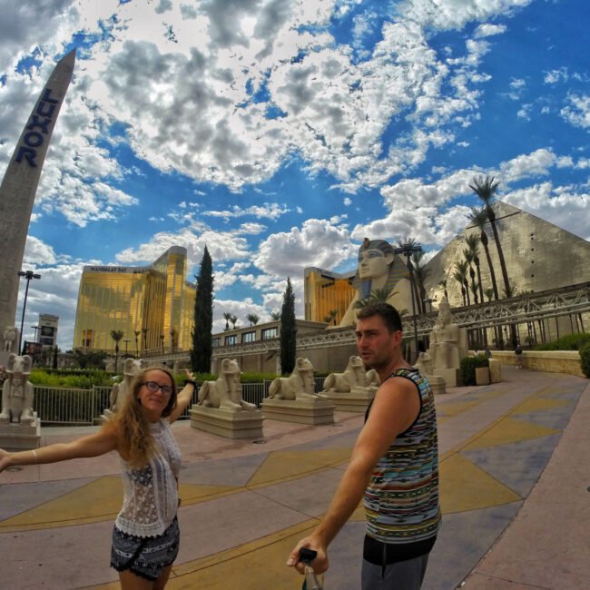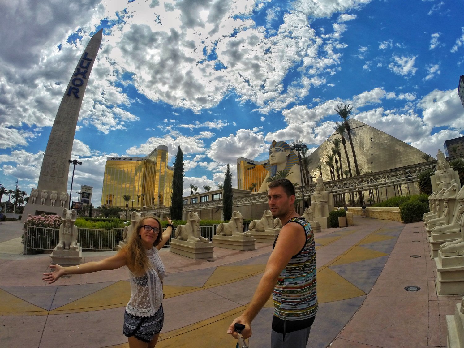 We threw it behind our heads and started looking forward to the rest, the clean hotel room and the illuminated Las Vegas. The way back under the hills was great, full of turns, no cars and high speed. I at least enjoyed the ride, since Lenka kept complaining that she would get sick. Those views were only a bit behind yesterday’s. The continuation of the journey was also quite interesting, and it again had that right wild American flair. It quite surprised me that also Las Vegas is relatively high up, over 600 m above sea level, and there are mountains all around. As a city in the desert, I imagined it maybe a little differently, but at least I am a little wiser again, and as for other ideas, for example, temperature, they were fulfilled, and it was hellishly hot there. We checked in at half past four at the hotel Circus Circus and went out into the streets in the evening. We were quite tired, so we only went lightly and for a short time, since the wind picked up later and a storm was approaching. But we managed to capture the incredible atmosphere of the city, and at least for a little while, we devoted our gaze to most of the famous hotels on the Strip. But already now, I was looking forward to exploring it a bit more since Lenka had already spent a few days in Las Vegas before and knew the city quite well.