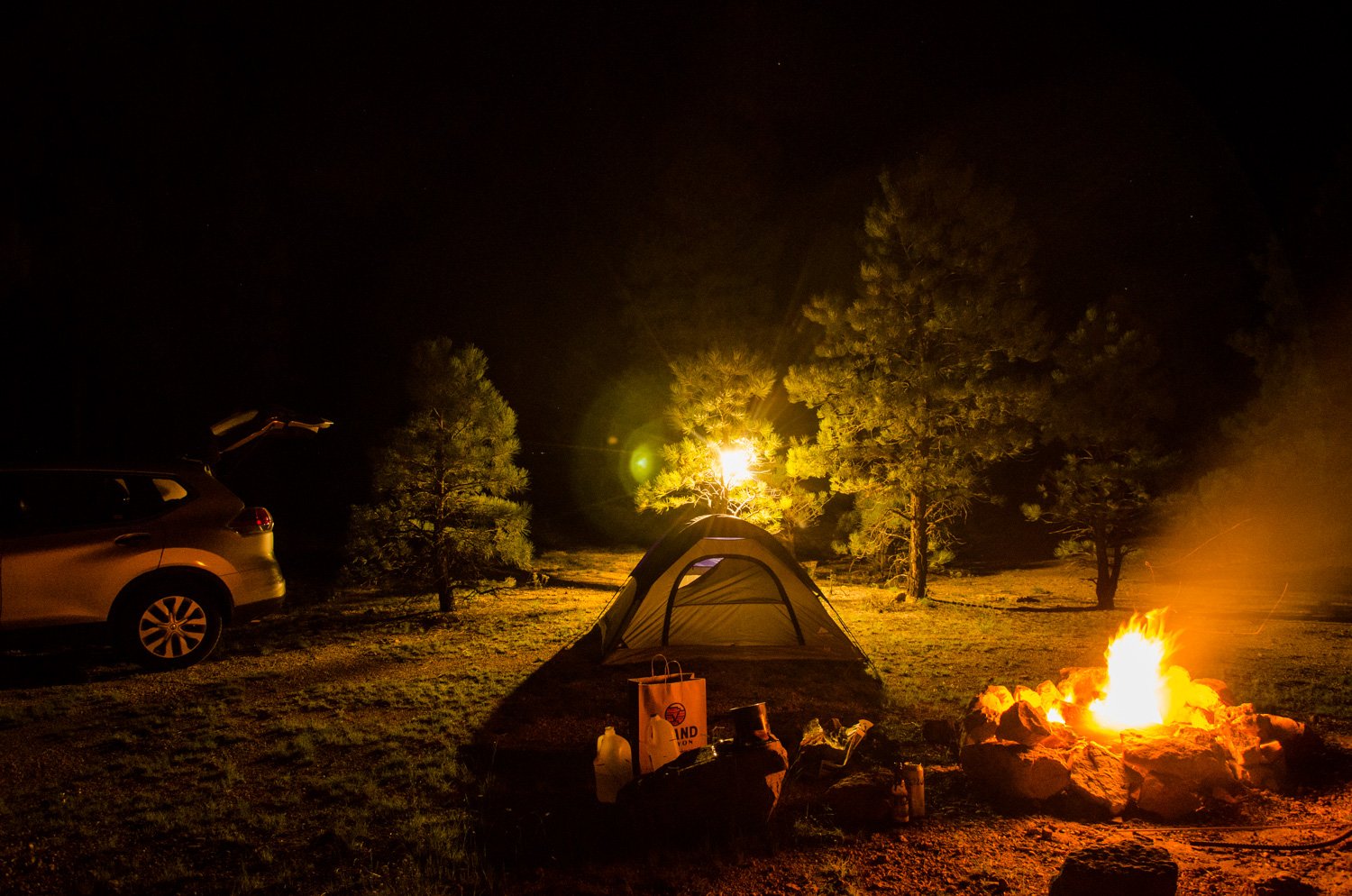 When leaving Grand Canyon, we managed to buy a few pieces of wood in one of the shops to start a fire in the camp we were heading to. We managed to arrive while it was still dusk, but to our great disappointment, a sign was waiting for us in front of the camp that it was full. At first, we were surprised that such a huge camp managed to fill up completely, but when we realized that it was Saturday and how many people were actually in the national park today and what a problem there was with parking, we were again only left to praise the American love for camping and just hope that we would sleep in a tent at all today. We also realised that we could have easily occupied some spot in the camp in advance, and now an already pitched tent could have been waiting for us. It’s a pity that it was supposed to be our last night in the wild; next time we will definitely do it this way. The only positive thing was that there were supposed to be several other primitive camps in the area, and we even found instructions on how to get there directly here on a few of them. We found the nearest camp quite quickly, but there were several roads there and as we set out on one of them, leading deep into the forest, and passed the individual sites, at each one we were met with the announcement that it was already occupied. We would have been able to fit easily everywhere with our, by American standards, small car and small tent, but it would be like entering someone’s imaginary private land. Maybe some people wouldn’t mind, but others maybe would, and so we wandered there for over half an hour and searched in vain for a free spot. In the end, we decided to return and stay quite close to the main road, where, although the site was not marked, there was enough space for a car and a tent, and the fireplace indicated that we were not the first ones who spent the night here. The light of the fire of our tent neighbours provided a sense of security in the foreseeable distance, and on the other side, again from time to time, the sound of a passing car. I started a fire as well, probably even sooner than I pitched the tent, because on one hand I had that bought wood and there was no problem to also collect wood from the ground. We sat outside for quite a long time in the evening, since we had enough to drink, eat, and it was our last night in this style, so we tried to enjoy it.