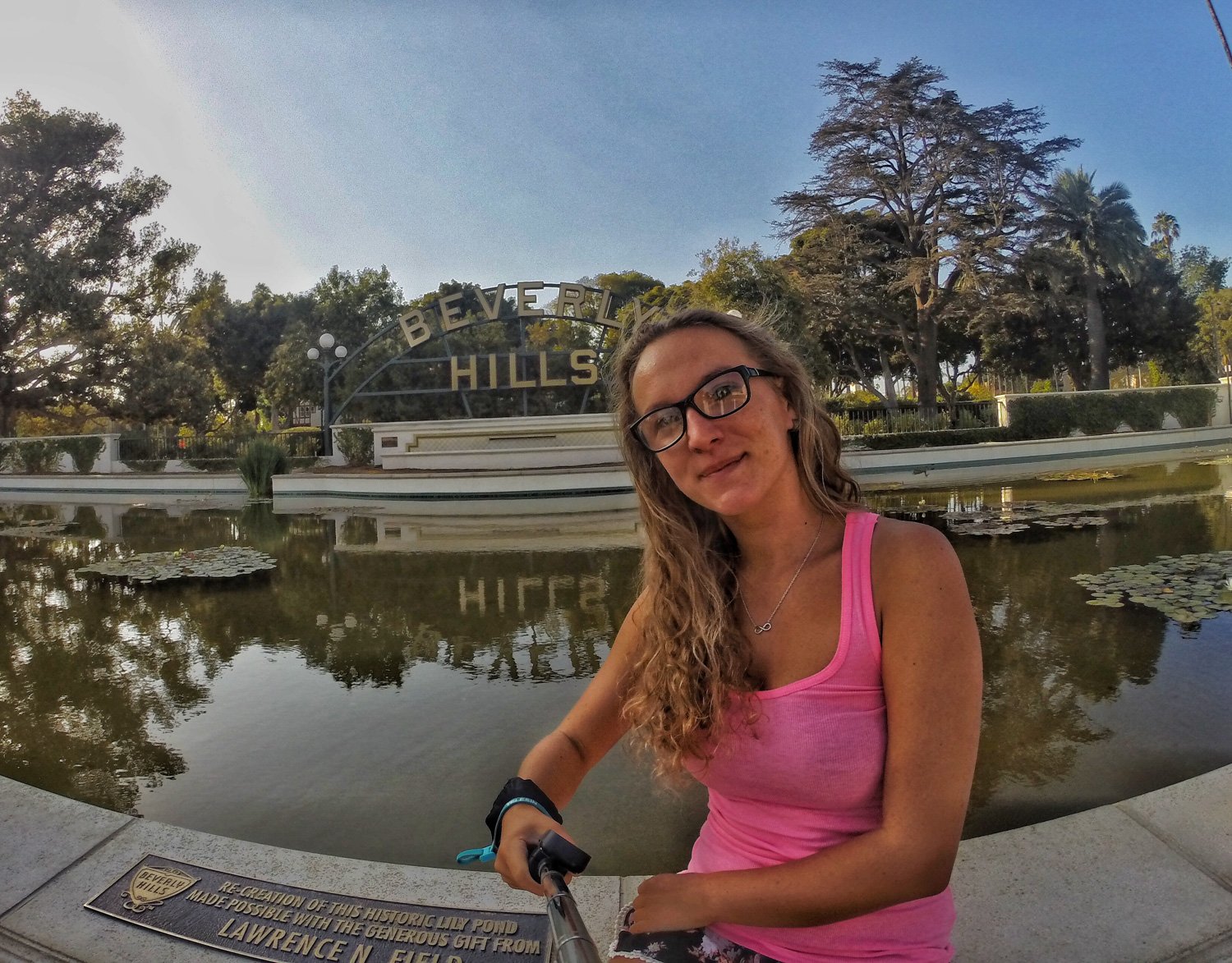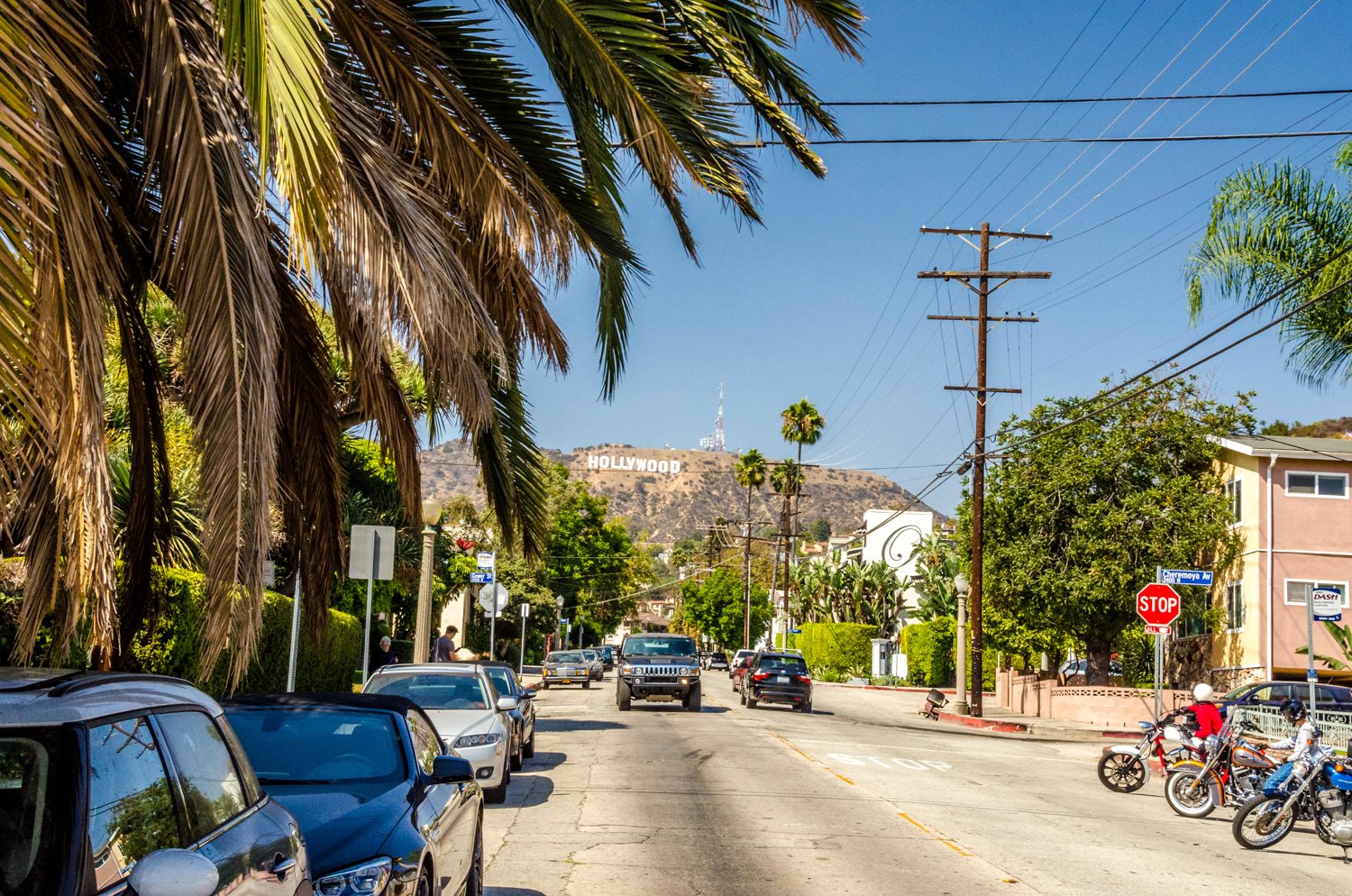 The first places we set out to look at were Beverly Hills and Hollywood. First, we went to the quasi-official view of LA and the Hollywood sign on the hill at Griffith Observatory. Lenka had already been here two years ago and said that the observatory itself is great, but now it was closed, and the views from there disappointed me a little. Downtown LA was sunk into fog and could hardly be seen, and the Hollywood sign was terribly far and tiny. We were only there for a while, and since I wasn’t satisfied with what I saw, I started looking for other places on the map where the view might be better. We headed straight under the hill with the Hollywood sign, and it was much better. Not only that, but we also went out into the streets of Hollywood, where I was a bit surprised that there aren’t a lot of similarly-minded tourists here, but even those few wandering cars that we met there are probably enough to bother the locals. And truthfully, I don’t even blame them when foreigners come there every day and block incredibly narrow alleys winding through the houses up the hill with absolutely no possibility to park. In front of one of the houses, a local managed to tell us that if we continue, the police will stop us. And we actually met the police later, but they only turned us back. More police patrols were there, another told us to go back under the hill, park there and return on foot, which was not very tempting. But then I started to realise how stupid it is of us to bother them and that this place really couldn’t handle more tourist traffic, and it is good to take measures to keep foreigners from going there. On the other hand, thanks to my curiosity, we again had some more experience, and we drove the streets where the Hollywood sign was already terribly close to us, and we saw how huge it is.