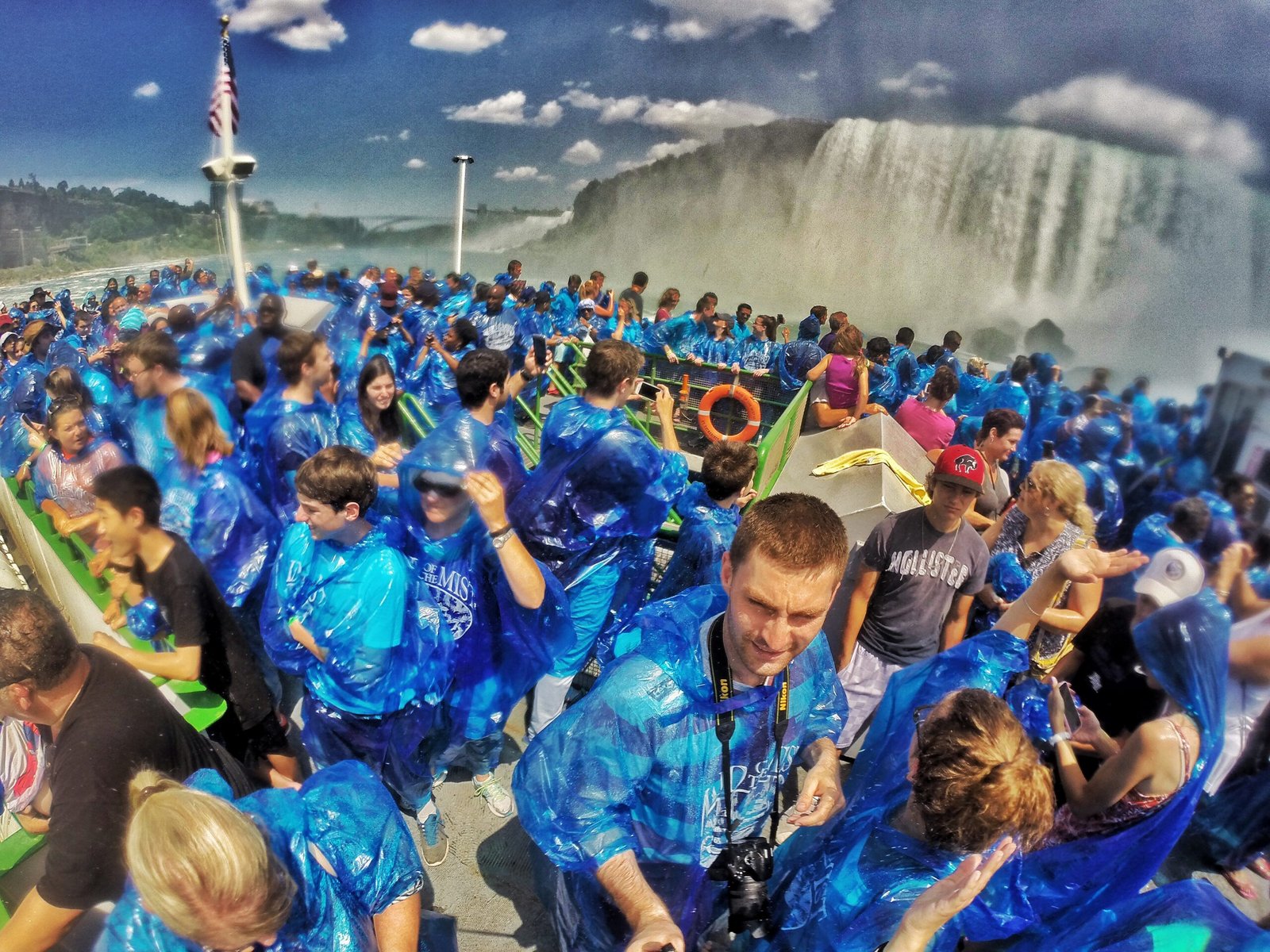 For a while, we just wandered around the park, admiring and looking for good places to take pictures. Then we decided to pay for one of the attractions, a boat trip directly under the waterfalls. The idea was definitely good, and it’s really worth it for $18 per person. It’s a pity about that Saturday and the fact that we waited an hour and a half in line for our boat. The sun was incredibly hot, and it also nicely burned our shoulders and heads. In the crowd of people, several individuals had problems with a lack of fluids, so the organisers ran around with bottles of water.